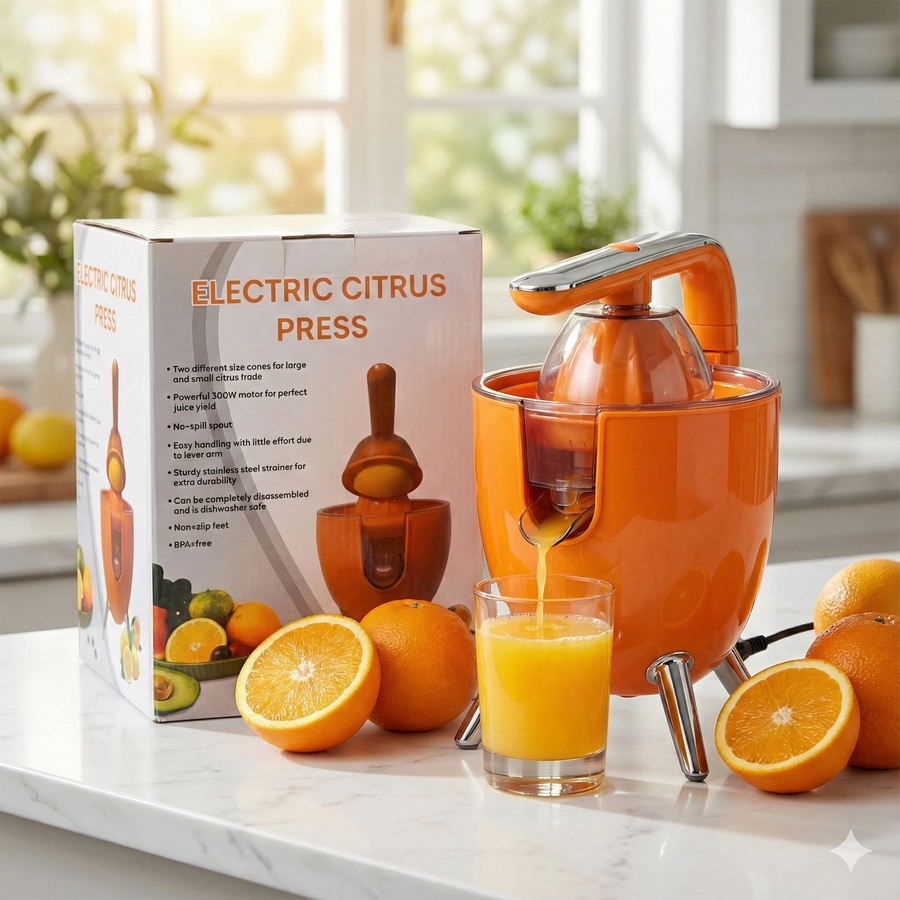 عصير طازج بدون تعب! عصارة قوية 300 واط تعطيك كل قطرة من الحمضيات 🍋 ذراع ضغط سهل الاستخدام وفوهة مانعة للتنقيط