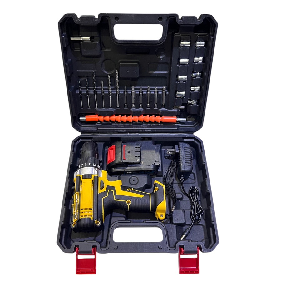 استمتع بأداء قوي وتعدد في الاستخدام مع هذا الطقم الشامل للمثقاب اللاسلكي، المصمم لإنجاز مهام الحفر والفك والتركيب بسهولة وكفاءة في المنزل أو الورشة.
