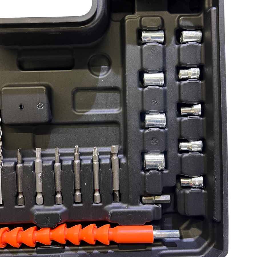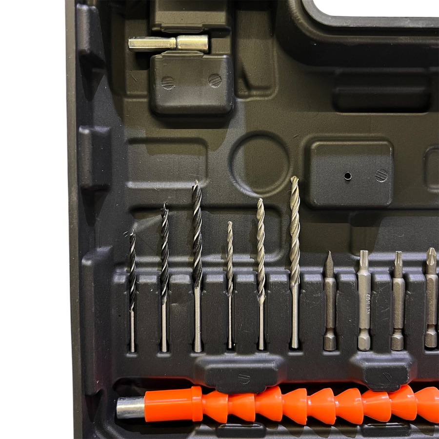 مجموعة ملحقات شاملة: يأتي الطقم في حقيبة حمل متينة تحتوي على مجموعة واسعة من لقم الحفر والقيادة المختلفة، بما في ذلك وصلة مرنة للأماكن الصعبة، مما يجعله جاهزًا لأي مهمة تقريبًا.