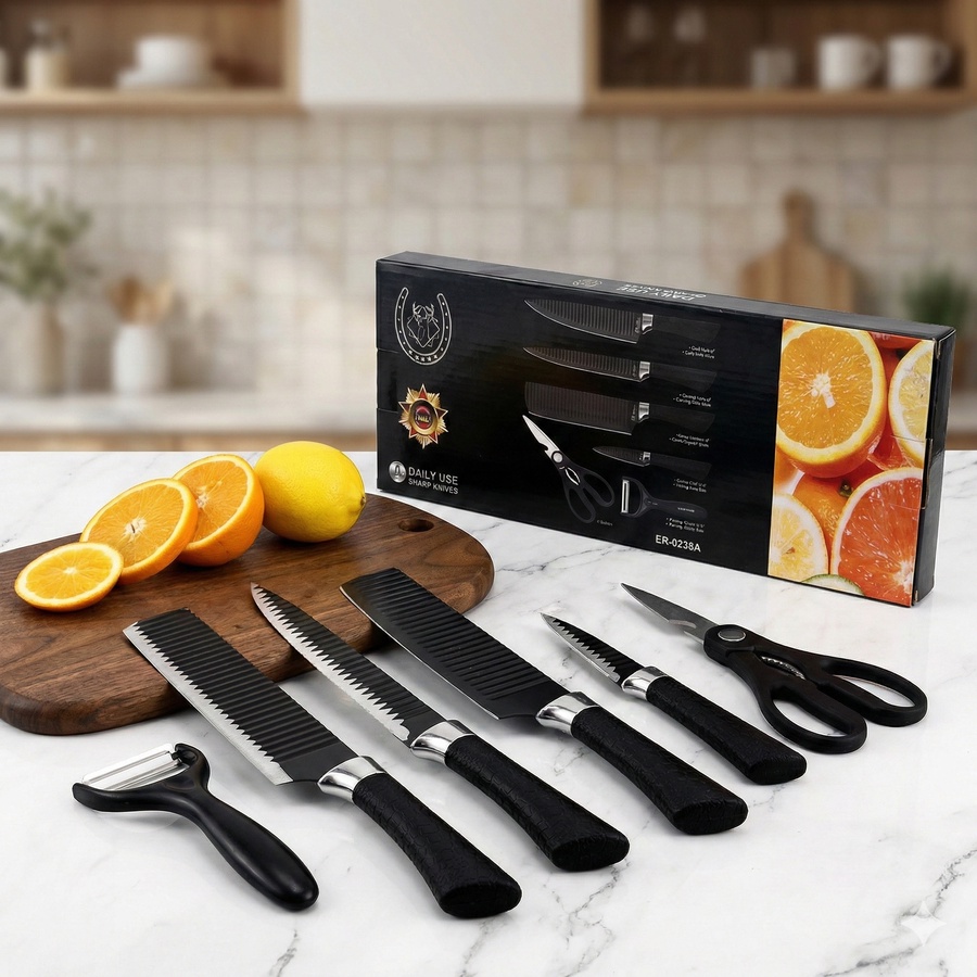 طقم سكاكين مطبخ عملي مكوّن من 6 قطع، مصمّم للاستخدام اليومي ويغطي احتياجات التقطيع الأساسية في المطبخ.