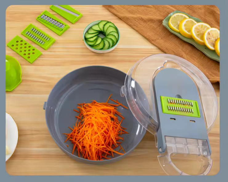 قطّاعة خضار عملية تجمع عدة أدوات تقطيع في جهاز واحد لتسهيل تحضير الخضار والفواكه بسرعة وبشكل منظم.