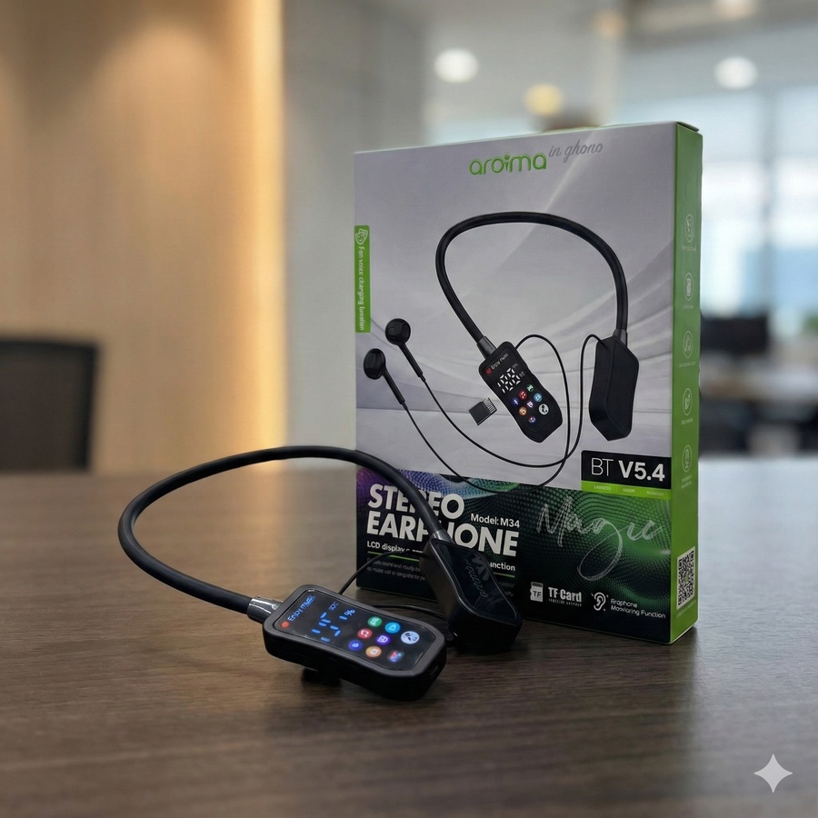 سماعة رقبة ستيريو من Aroima بتصميم عملي وشاشة LCD لعرض الحالة، مناسبة للاستخدام اليومي والمكالمات.