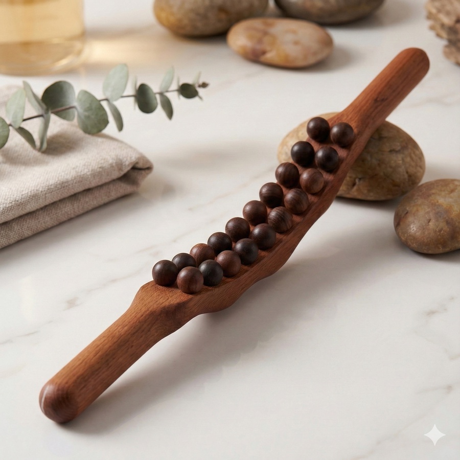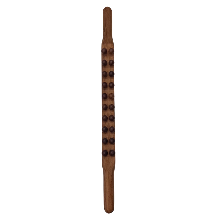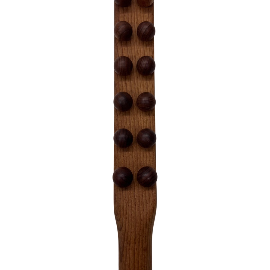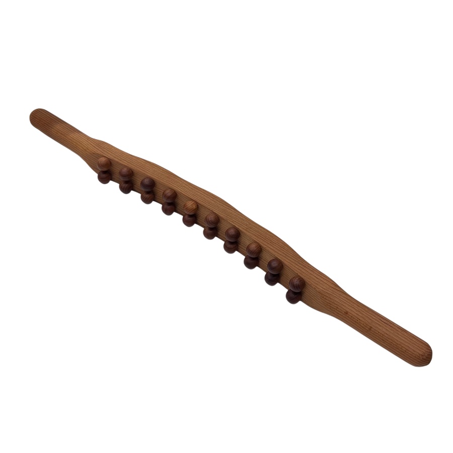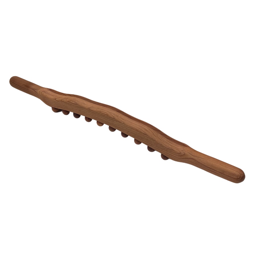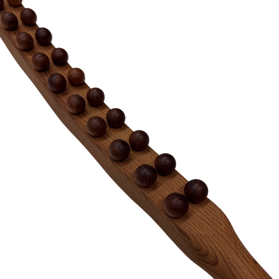 أداة تدليك يدوية مصنوعة من الخشب، بتصميم طولي منحني ومزودة بكرات خشبية بارزة لتمريرها على الجسم بسهولة.