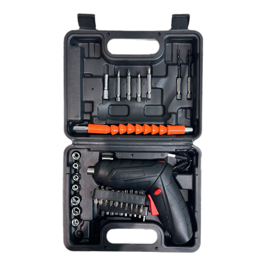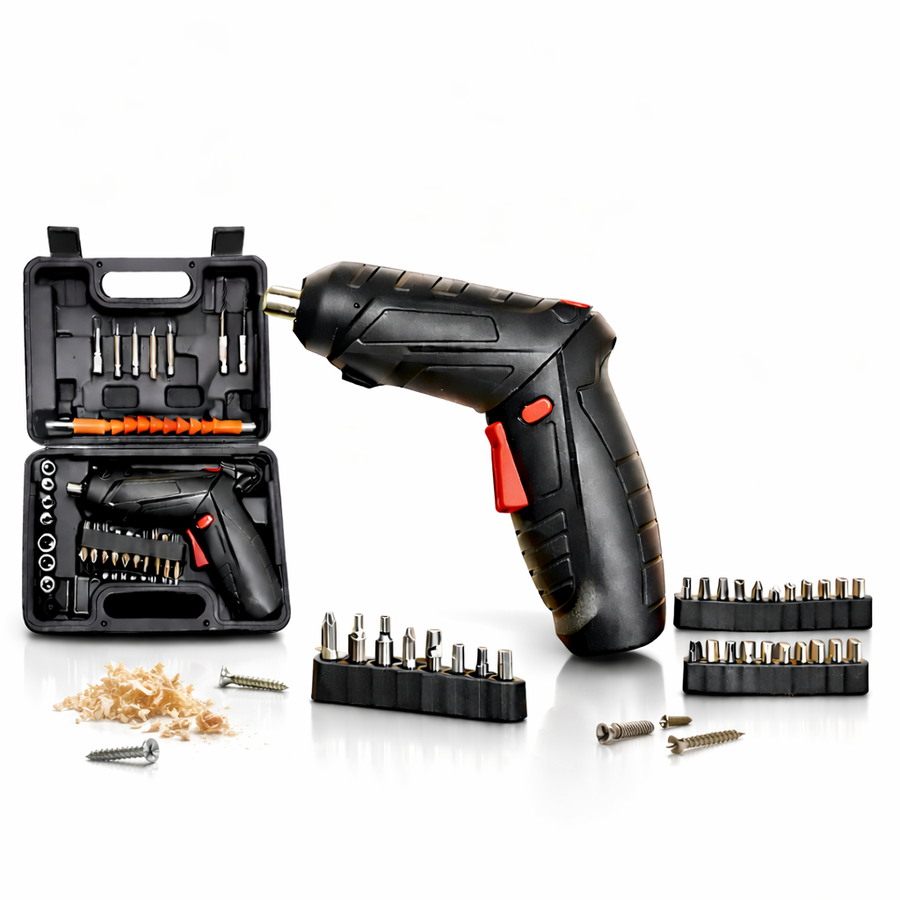 يتضمن مفك كهربائي قابل لإعادة الشحن وعدد كبير من الرؤوس المختلفة لتتناسب مع جميع أنواع البراغي والتثبيتات