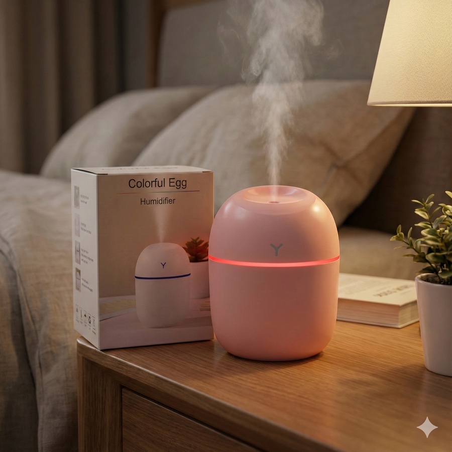جهاز ترطيب هواء إلكتروني صغير الحجم على شكل بيضة ملونة. يأتي بتصميم مدمج وجذاب على شكل بيضة، متوفر بألوان مختلفة (مثل الأبيض والوردي والأزرق).