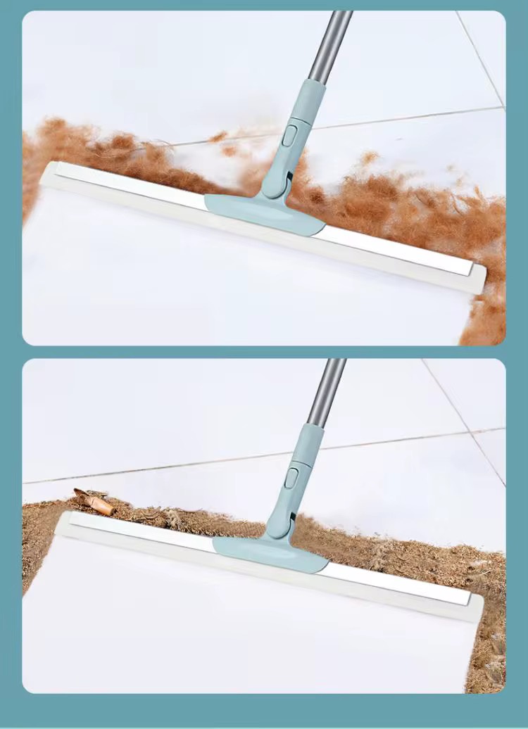 ممسحة عملية بتصميم ذكي تجمع بين الكنس الجاف والتنظيف الرطب، مزودة بشريط سيليكون مرن وذراع قابل للتعديل لتسهيل تنظيف الأرضيات والزوايا وتحت الأثاث