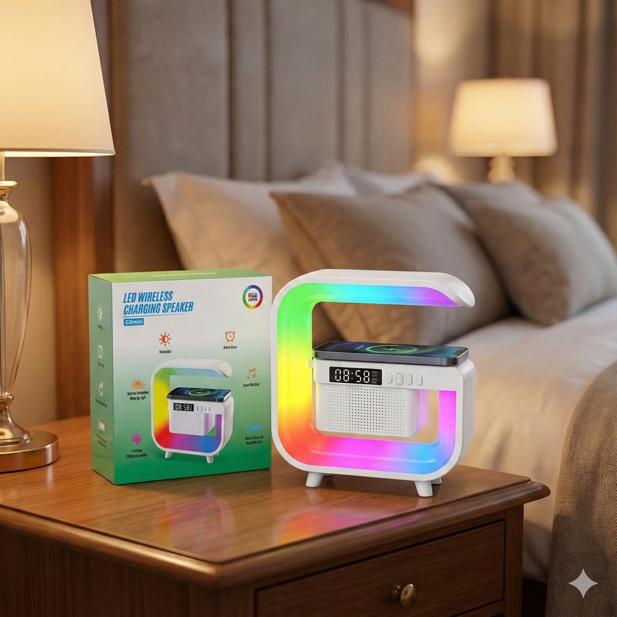 ساعة منبه ذكية ومصباح نوم: يعمل كمنبه رقمي مزود بخاصية محاكاة شروق الشمس للمساعدة على الاستيقاظ بشكل طبيعي، كما يوفر أوضاع إضاءة دافئة ومريحة للنوم.