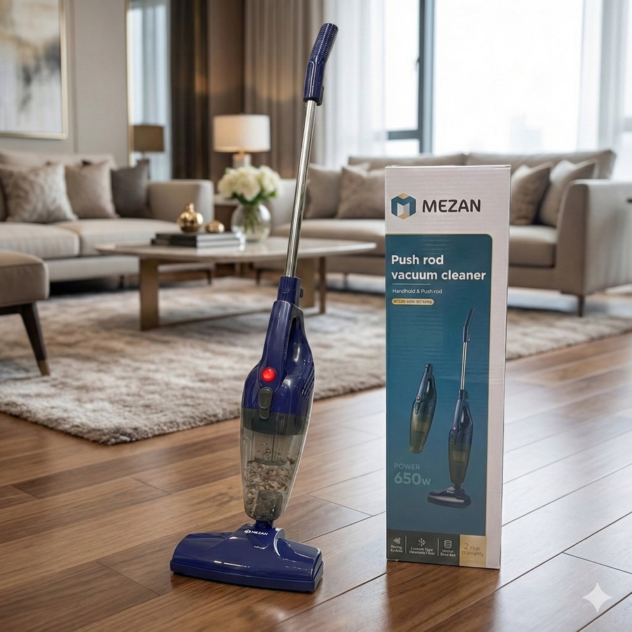مكنسة كهربائية من MEZAN بتصميم عملي يجمع بين الاستخدام اليدوي والعمودي، مناسبة للتنظيف اليومي بقدرة ثابتة وسهلة الاستخدام.