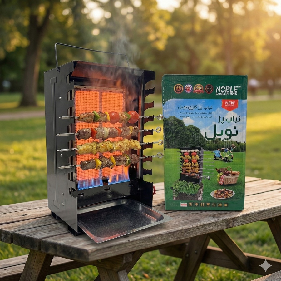 شواية غازية من نوبل مخصصة لشواء الكباب واللحم بطريقة عمودية، مناسب للاستخدام المنزلي والخارجي.