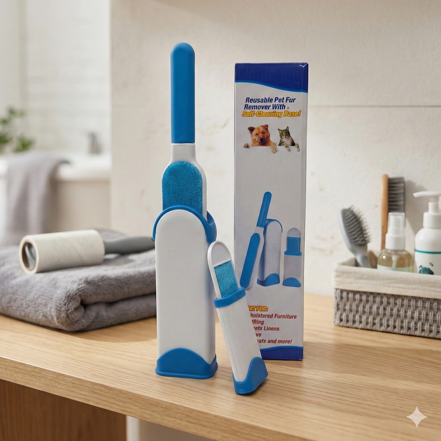 أداة عملية لإزالة وبر وشعر الحيوانات الأليفة من الأسطح المختلفة، بتصميم بسيط يعتمد على قاعدة تنظيف ذاتي لسهولة الاستخدام بدون مواد إضافية.