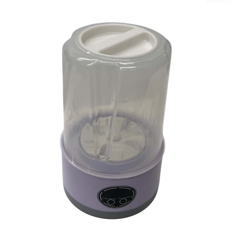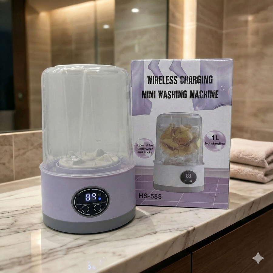 - جهاز محمول وموفر للمساحة مصمم خصيصًا لغسل الملابس الداخلية والجوارب وغيرها من الملابس الصغيرة. تعمل بالشحن اللاسلكي وتتميز بتصميم مدمج يسهل حملها واستخدامها