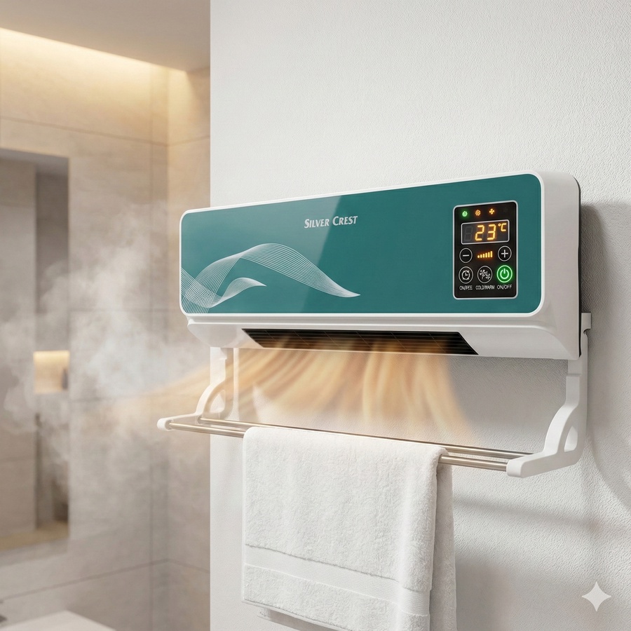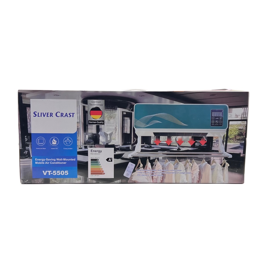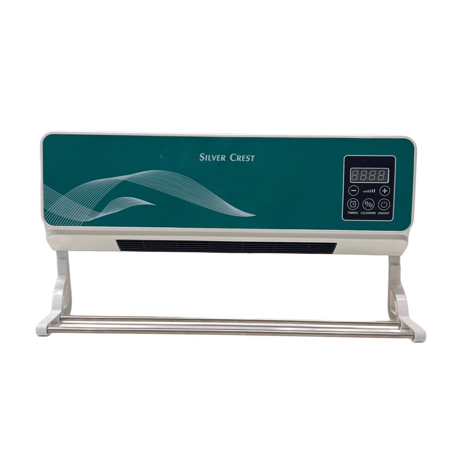 هذا جهاز تدفئة جداري مُصمَّم ليُثبَّت على الحائط ويُستخدم لتجفيف أو تدفئة الملابس من الأسفل • تصميم مزدوج الاستخدام: يوضع على الطاولة أو يُعلّق على الحائط