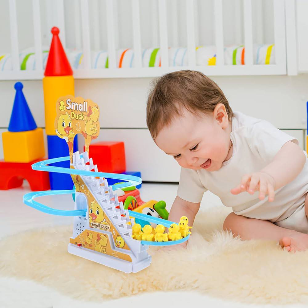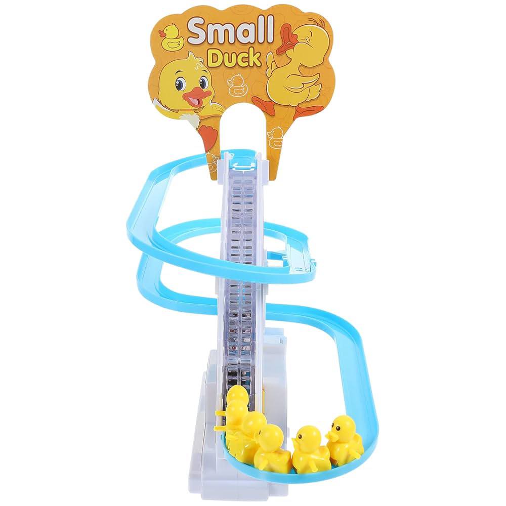 مزودة بإضاءة LED ومسار صوتي ممتع مع زر تشغيل/إيقاف، تصعد البطة السلالم ثم تنزلق عبر الزحليقة.