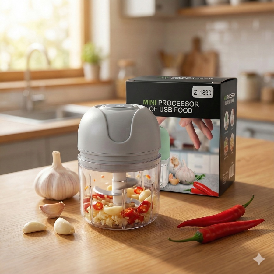 فرّامة شحن عملية ومحمولة تعمل بضغطة زر واحدة فقط من الأعلى مثالية لفرم الثوم، الفلفل، الأعشاب، والمكسرات بسهولة وسرعة.