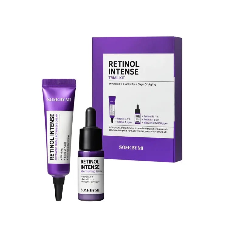 مجموعة Some By Mi للعناية بالبشرة تحتوي على سيروم ريتينول وكريم حول العينين مصممة لتحسين مرونة البشرة وتقليل ظهور التجاعيد. السيروم يتغلغل بعمق في البشرة ليمنحها الترطيب والعناية المثالية، بينما يعمل كريم العين على تفتيح البشرة حول العين وتقليل ظهور التجاعيد والخطوط الدقيقة بفضل مزيج الريتينول، النياسيناميد، وحمض الترانساميك. المجموعة مصممة لتكون لطيفة على البشرة وتوفر نتائج فعالة على المدى الطويل.