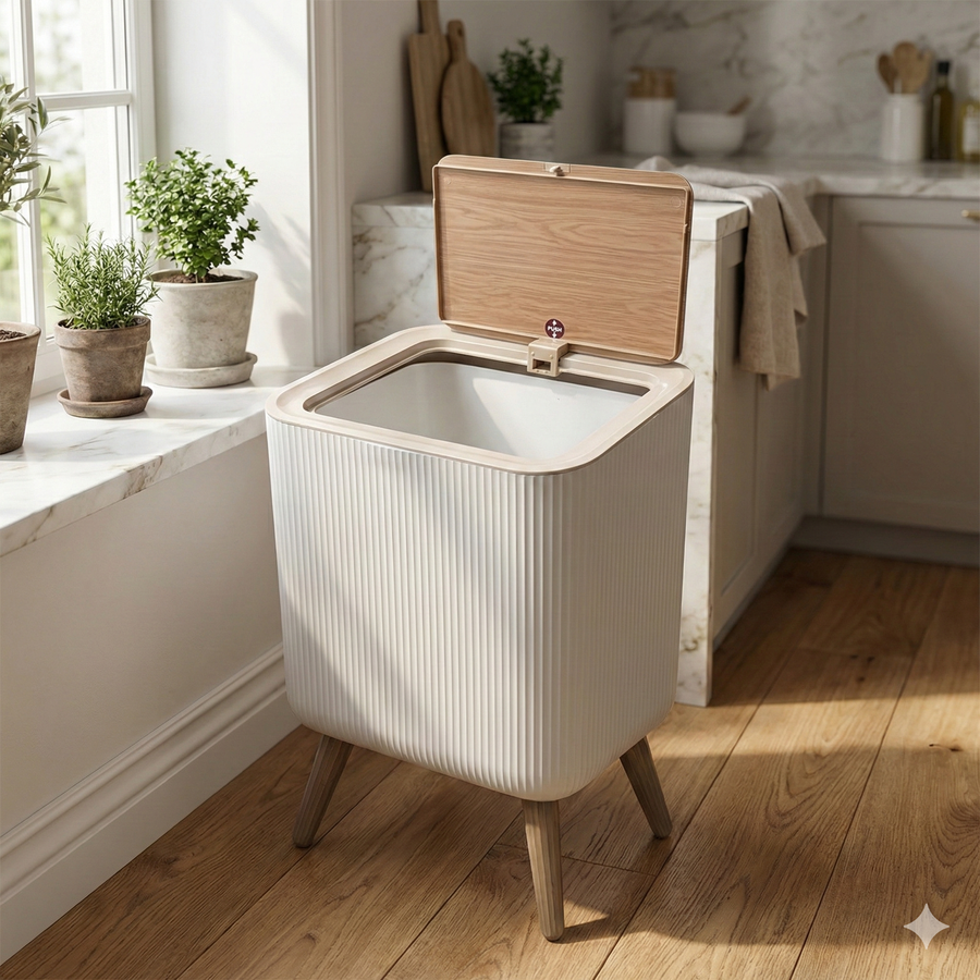سلة نفايات عملية بتصميم عصري تجمع بين الشكل الأنيق والاستخدام اليومي، مناسبة للمنزل أو المكتب.