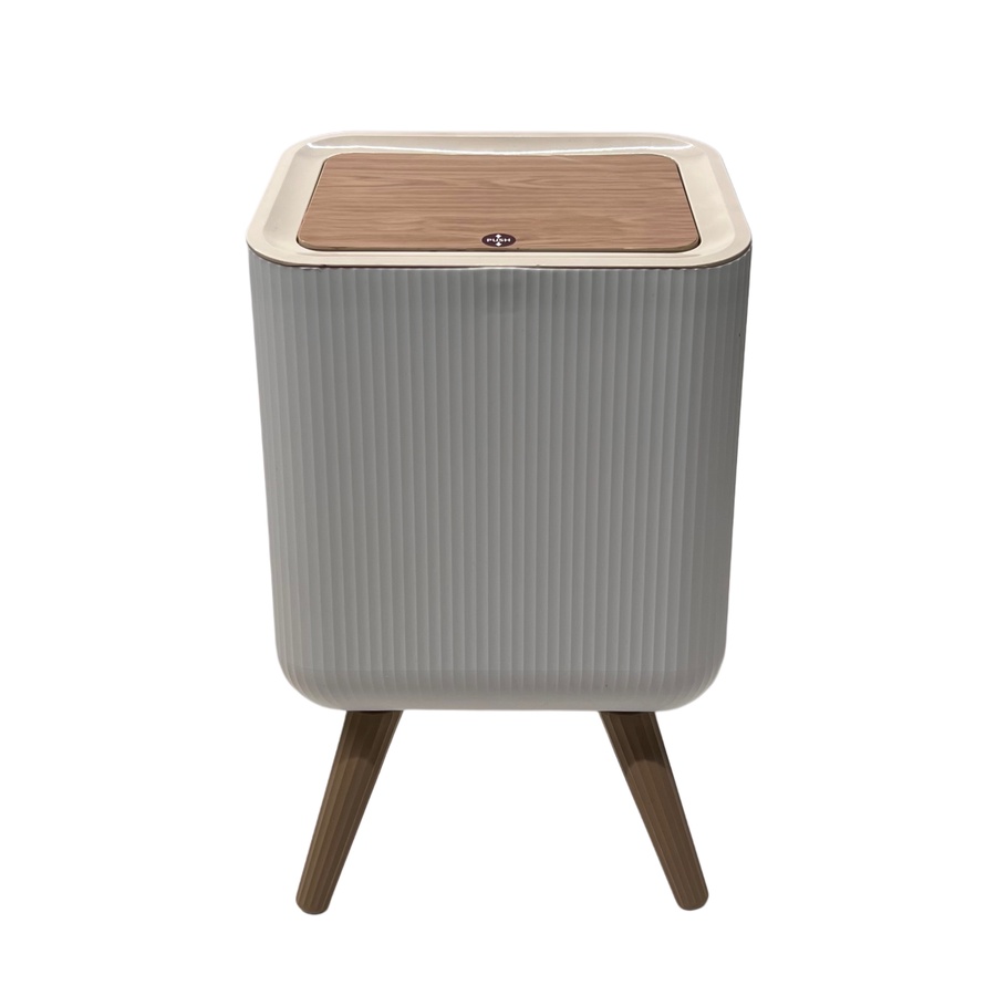 سلة تخزين أنيقة بغطاء ضغط وتصميم خشبي على أرجل