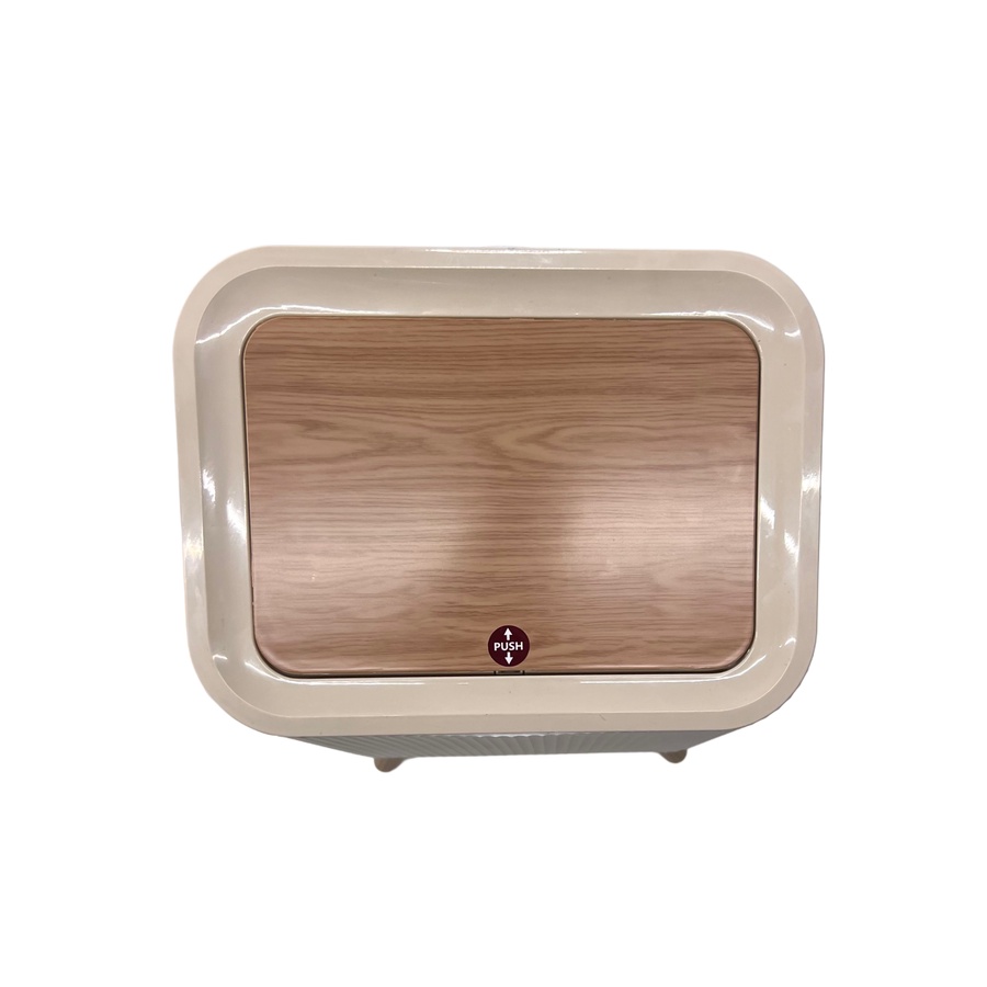 • غطاء علوي بلون خشبي مزوّد بآلية PUSH (ضغط) لسهولة الفتح والإغلاق.