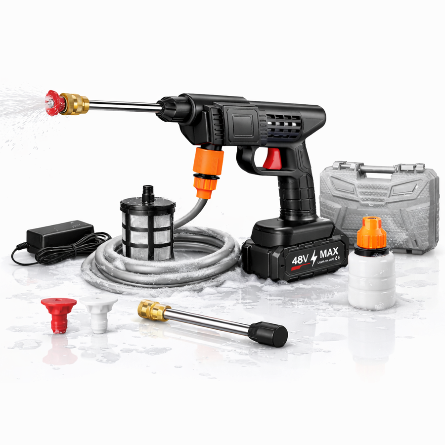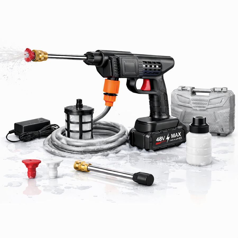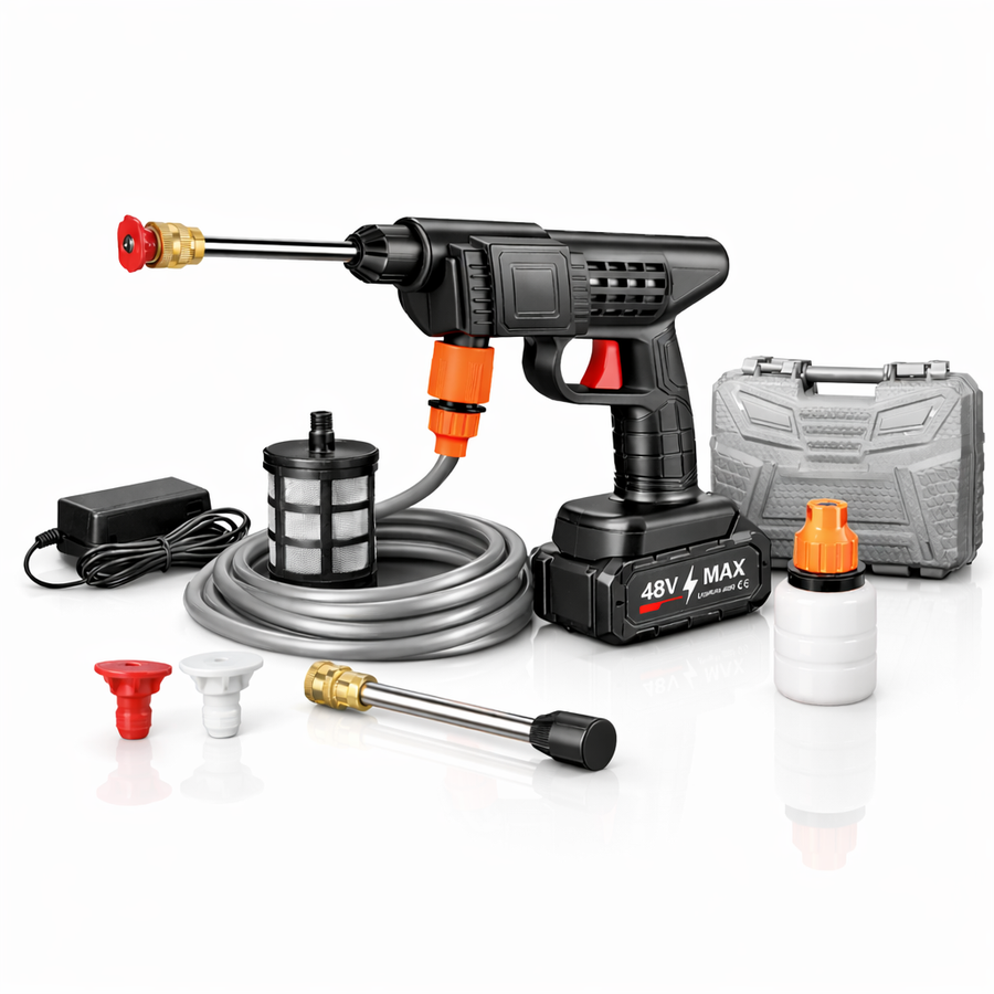 • جهاز غسيل سيارات كهربائي محمول يعمل ببطارية ليثيوم، مصمم للاستخدام الذاتي بسهولة وفي أي وقت.
