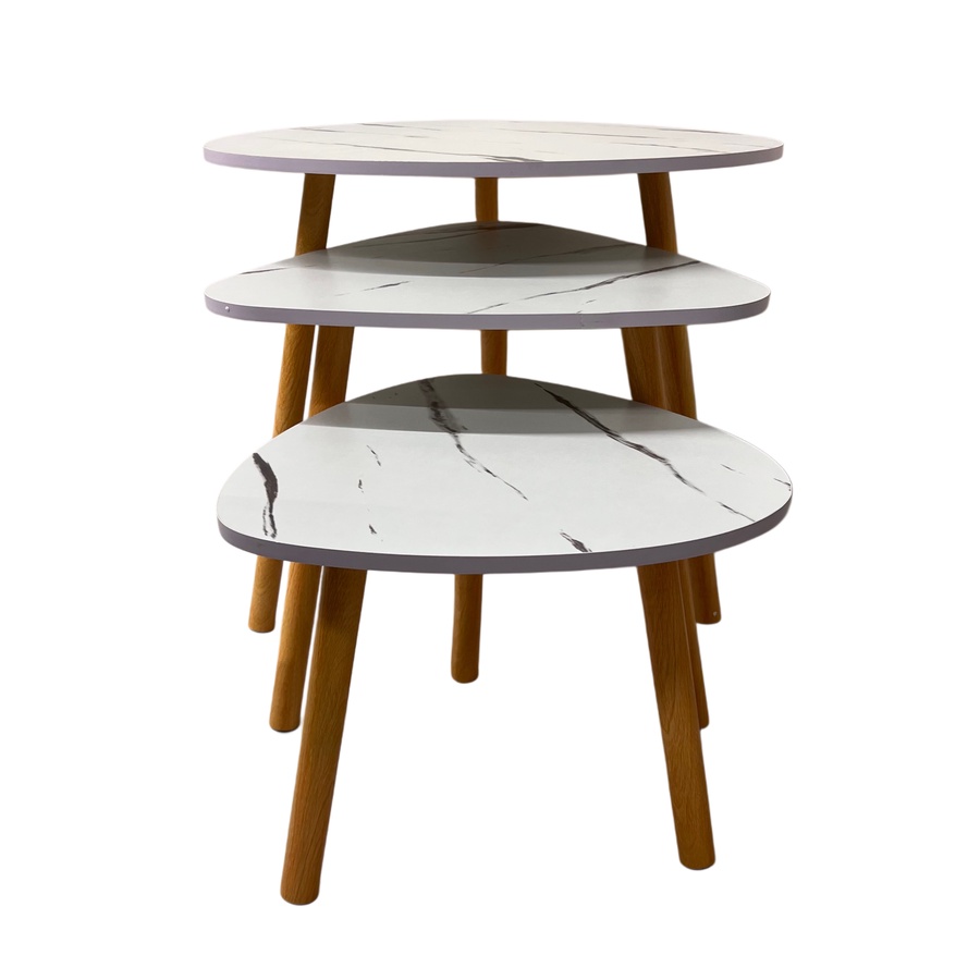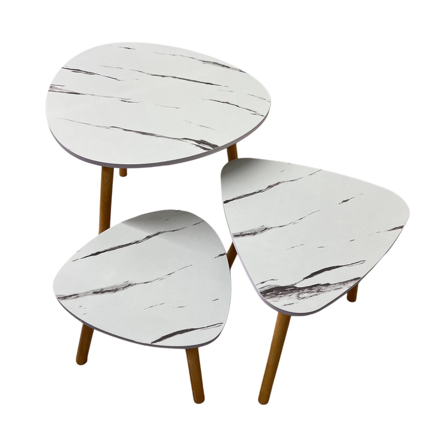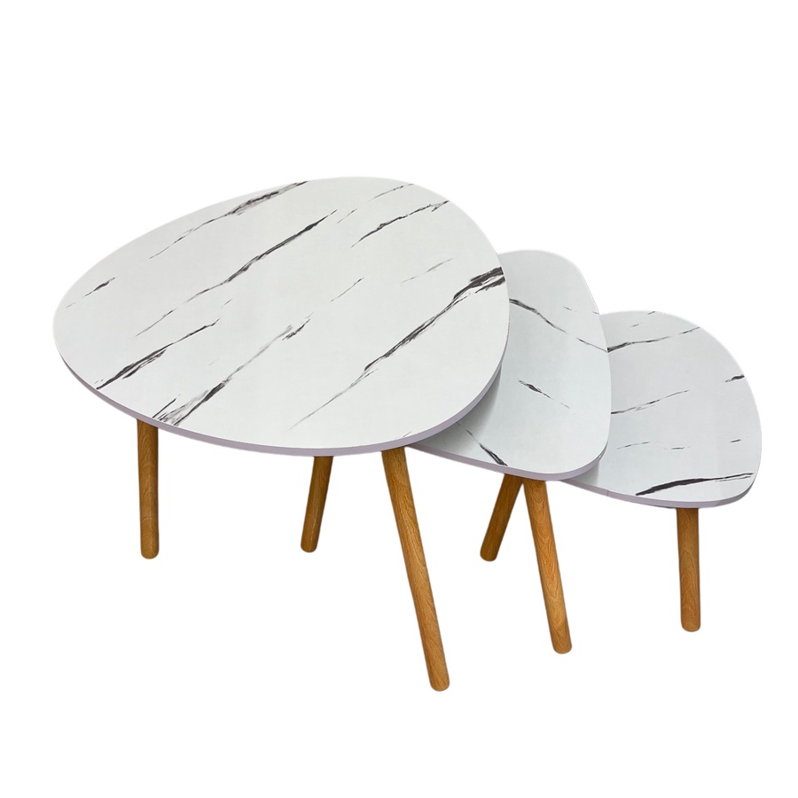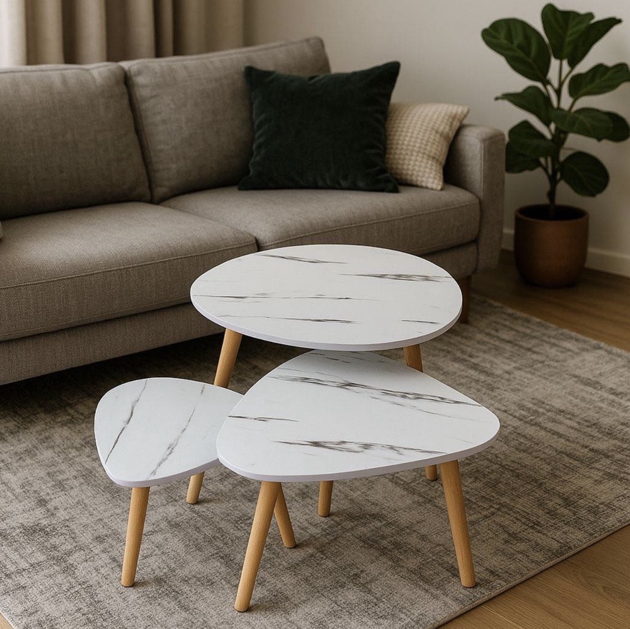 - طقم طاولات مودرن بتصميم رخامي أنيق وأرجل خشبية تصميم عصري وجذاب هذا الطقم المكون من ثلاث طاولات يتميز بتصميم مودرن يضيف لمسة جمالية راقية على أي غرفة
