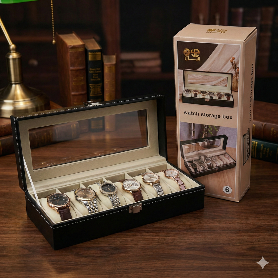 علبة أنيقة مخصصة لتخزين وتنظيم ساعات اليد، بتصميم عملي يعرض الساعات بشكل مرتب وواضح.