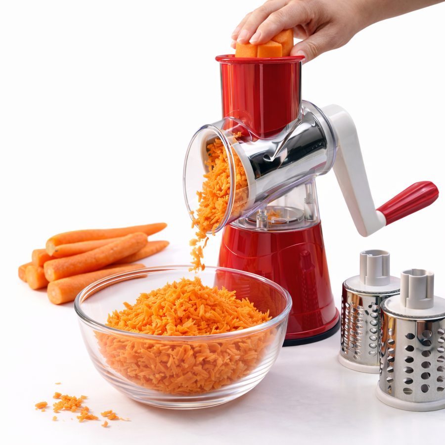• تحتوي على 3 أسطوانات من الستانلس ستيل قابلة للتبديل: برش ناعم، برش خشن، وتقطيع شرائح.