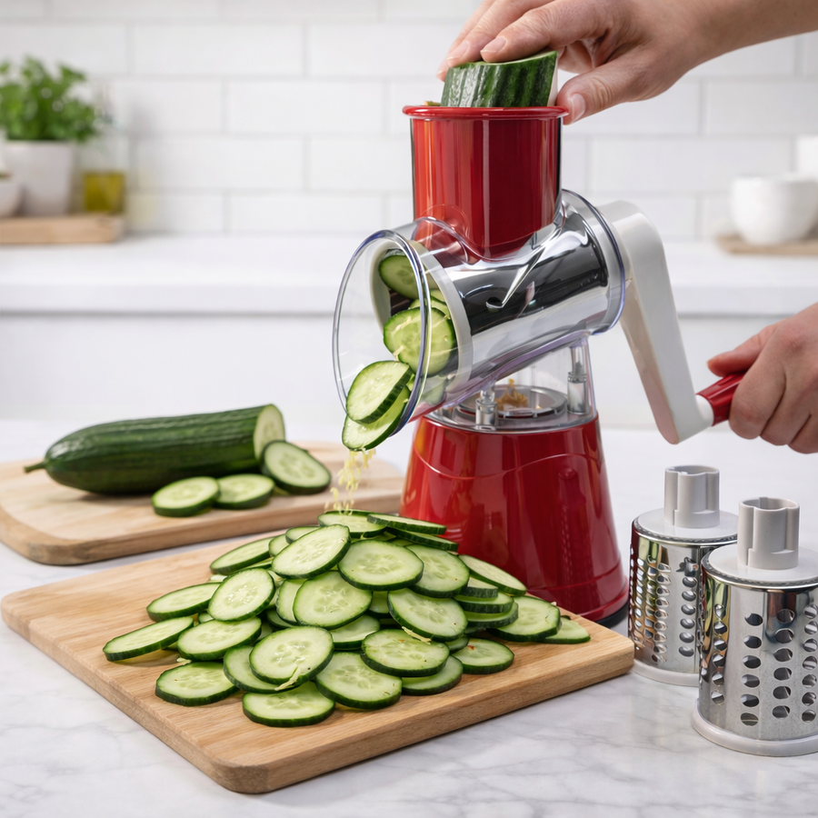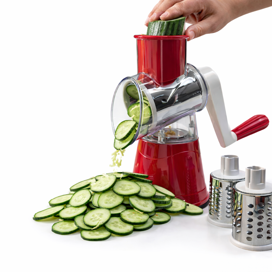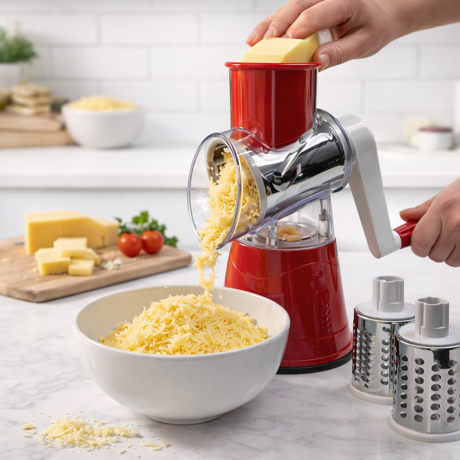 مبشرة دوّارة تعمل باليد مصممة لتبشير وتقطيع مجموعة متنوعة من الأطعمة مثل الجبن والخضار والمكسرات بسهولة على سطح الطاولة
